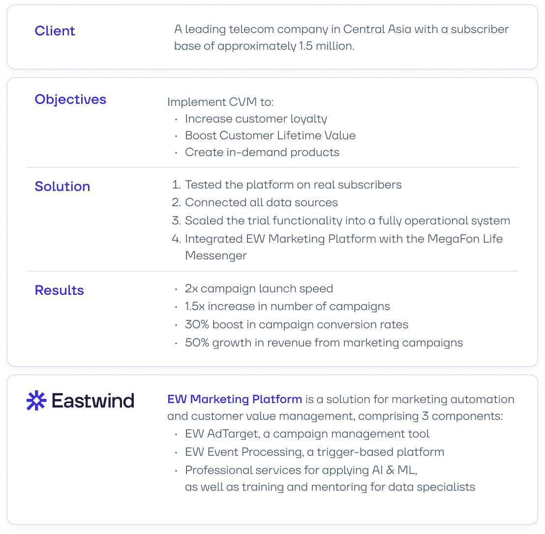 «We'd already worked with Eastwind on our messenger project, and they had supported us with other technology initiatives in the past. We knew they had a specialized CVM solution built specifically for telecom and had successfully implemented it across other CIS countries. That's why we decided to include their platform in the competitive evaluation».
