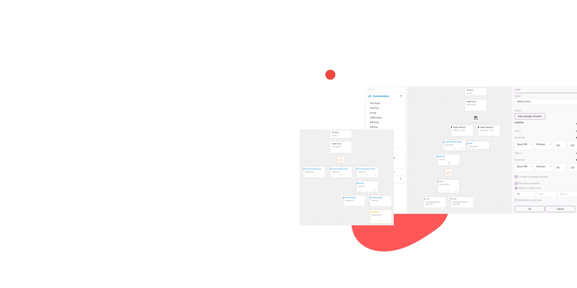 Выстраивайте и запускайте маркетинговые кампании любой сложности с помощью drag-and-drop конструктора, каждый блок которого отражает конкретную сущность: таргет-группу, событие, коммуникацию, оффер, отклик, бизнес-транзакцию. Интуитивно понятный интерфейс позволяет маркетологу легко интегрировать сегменты, каналы, предложения и триггеры в сценарий, связывать кампании друг с другом и создавать сценарии любой сложности простым способом.