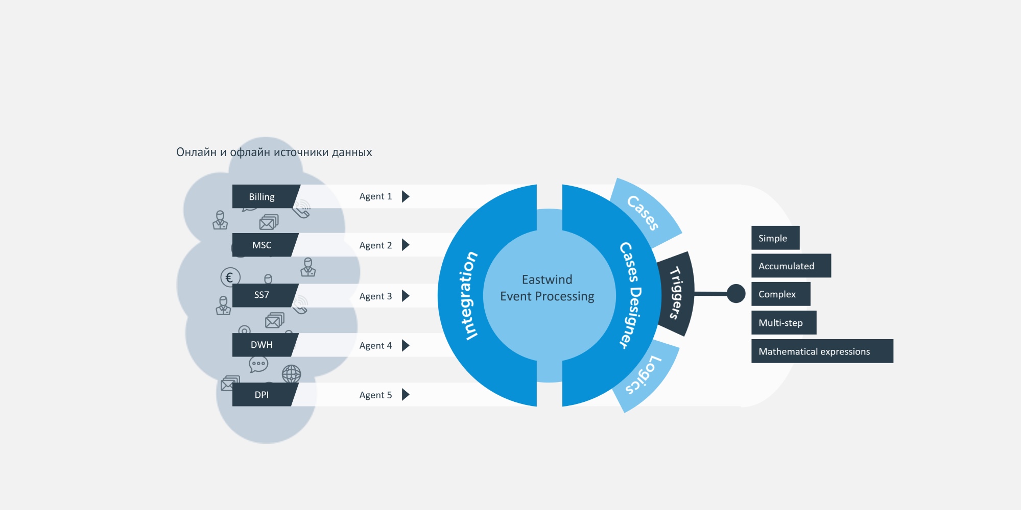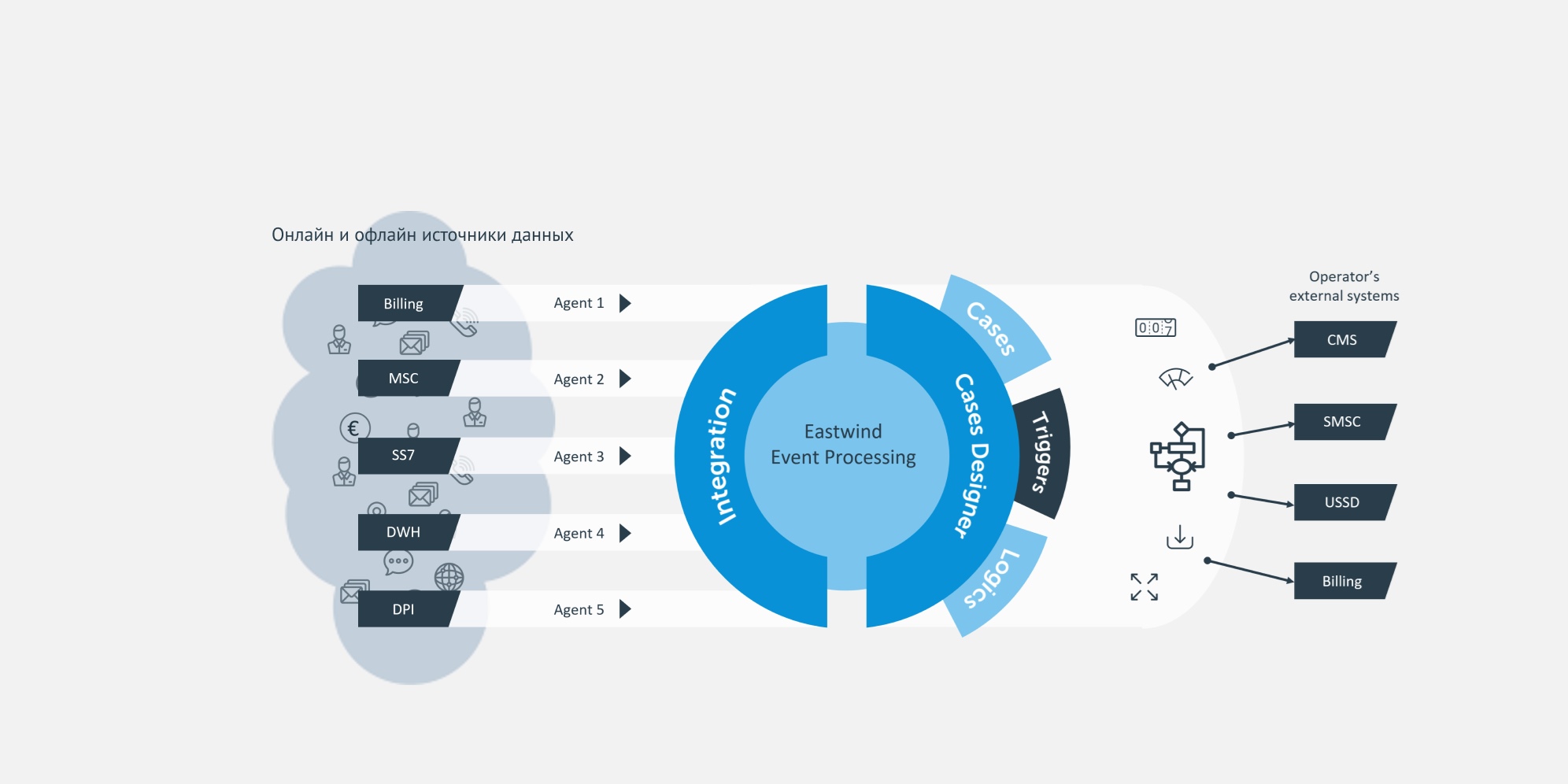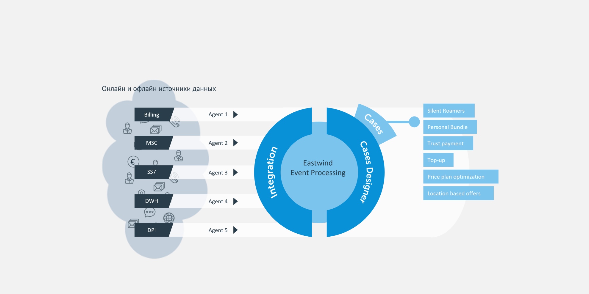 | Event Processing анализирует действия пользователей в сети в режиме реального времени: по звонкам, интернет-актвности, гео-перемещениям, изменениям баланса и другим событиям. В подходящий момент – например, когда абонент предрасположен к подключению дополнительных услуг, – система автоматически дает команду на отправку предложений.  |