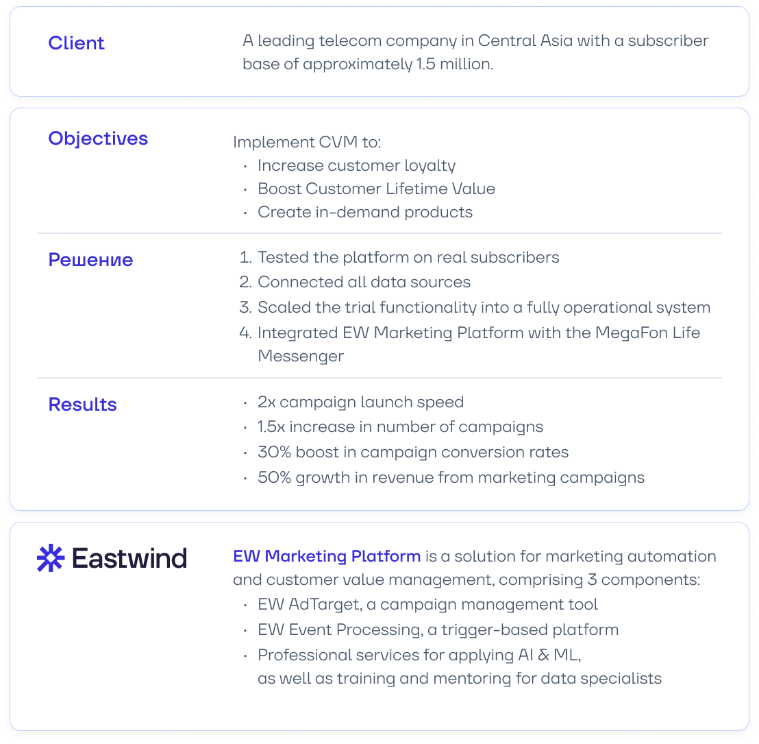 «We'd already worked with Eastwind on our messenger project, and they had supported us with other technology initiatives in the past. We knew they had a specialized CVM solution built specifically for telecom and had successfully implemented it across other CIS countries. That's why we decided to include their platform in the competitive evaluation».