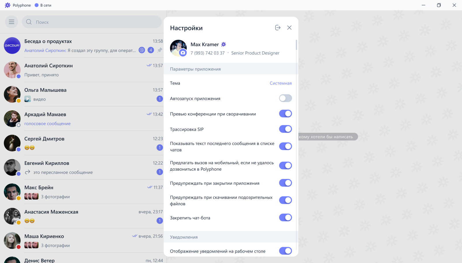 Помимо крупных обновлений, мы реализовали некоторые доработки. Например, синхронизировали настройку уведомлений о новых сообщениях между всеми клиентскими приложениями EW Polyphone. Теперь изменения в одном приложении автоматически применяются в другом.