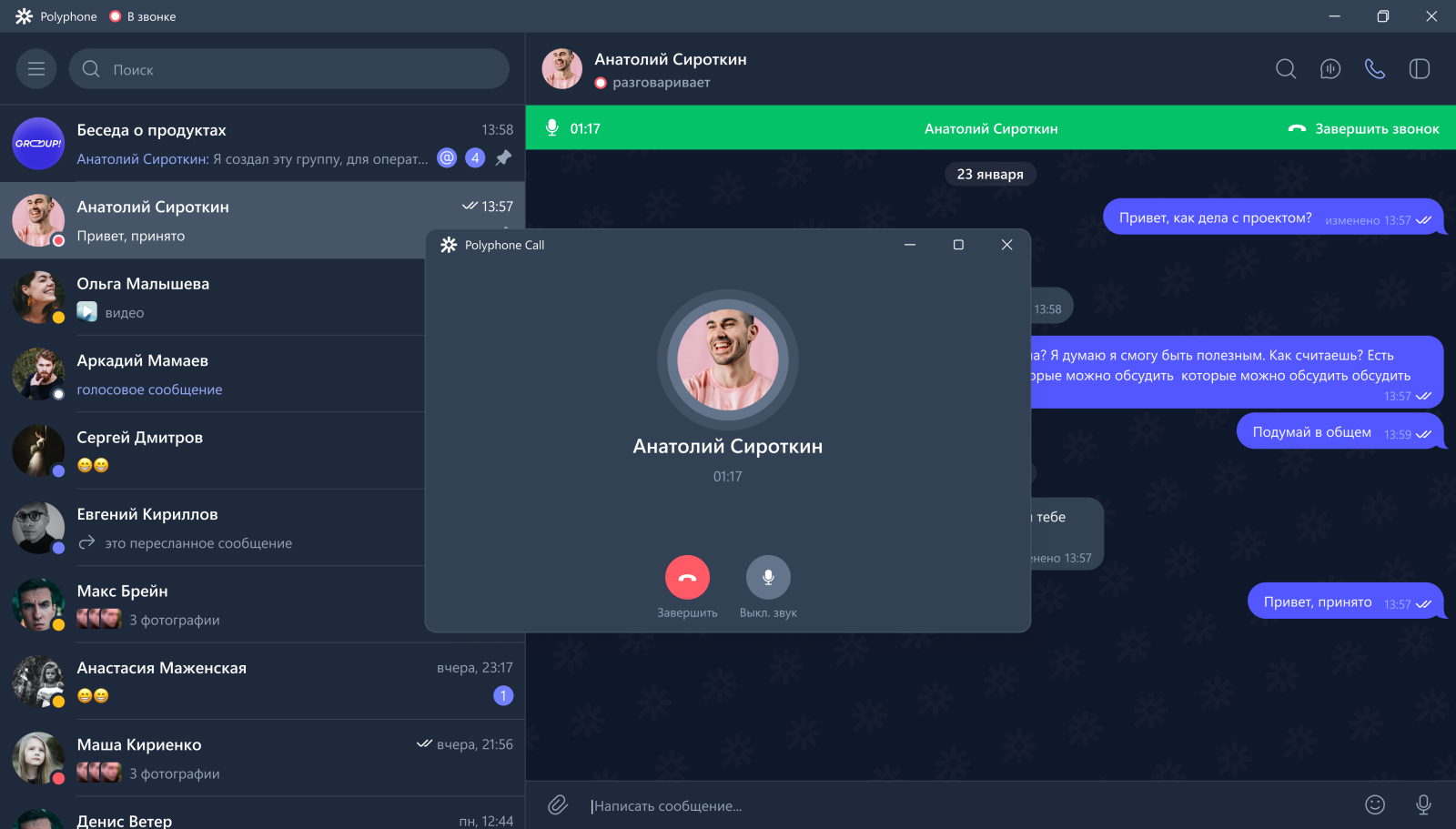 Раньше EW Polyphone использовался преимущественно для обмена сообщениями и звонков между абонентами. Теперь в приложении доступна полноценная система конференц-связи — пользователи могут проводить групповые звонки без сторонних сервисов как в десктопной, так и в мобильной версии решения. При запуске конференции в групповой чат автоматически отправляется уведомление..png)
